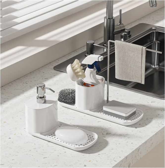جامایعی فشاری همراه با اسفنج و جای نگهدارنده، مناسب برای نظمدهی سینک و استفاده آسان از مایع ظرفشویی. طراحی ترکیبی از ABS مقاوم با ظاهر مدرن و کاربردی.