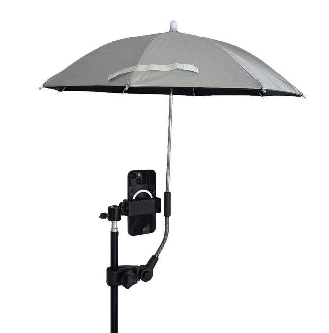 چتر قابل نصب روی سهپایه برای استفاده در عکاسی، لایو استریم و فیلمبرداری در فضای باز. دارای پوشش نقرهای برای محافظت در برابر آفتاب (UPF 50+) و طراحی مقاوم در برابر باران. ساختهشده از پلیاستر با اسکلت فلزی.